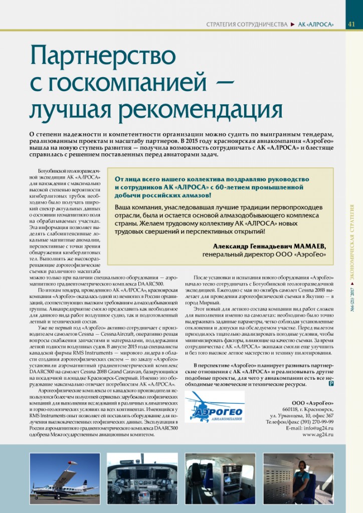 По итогам тендера, проведенного АК «АЛРОСА», красноярская компания «АэроГео» оказалась одной из немногих в России организаций, соответствующих высоким требованиям алмазодобывающей группы. Авиапредприятие смогло предоставить как необходимое для данного вида работ воздушное судно, так и подготовленный летный и технический состав.