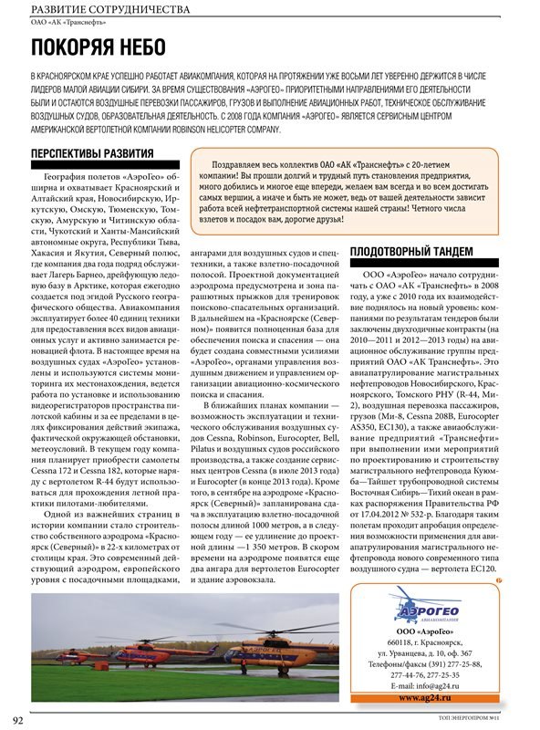 ООО «АэроГео» начало сотрудничать с ОАО «АК «Транснефть» в 2008 году, а уже с 2010 года их взаимодействие поднялось на новый уровень: компаниями были заключены двухгодичные контракты (на 2010–2011 и 2012–2013 годы) на авиационное обслуживание группы предприятий ОАО «АК Транснефть», заключенных по результатам тендеров. Это авиапатрулирование магистральных нефтепроводов Новосибирского, Красноярского, Томского РНУ (R-44, Ми-2), воздушная перевозка пассажиров, грузов (Ми-8, Cessna 208В, Eurocopter AS350, ЕС130), а также авиаобслуживание предприятий «Транснефти» при выполнении ими мероприятий по проектированию и строительству магистрального нефтепровода Куюмба-Тайшет трубопроводной системы Восточная Сибирь-Тихий океан в рамках распоряжения Правительства РФ от 17.04.2012 № 532-р. Благодаря таким полетам проходит апробация определения возможности применения для авиапатрулирования магистрального нефтепровода нового современного типа воздушного судна — вертолета ЕС120.