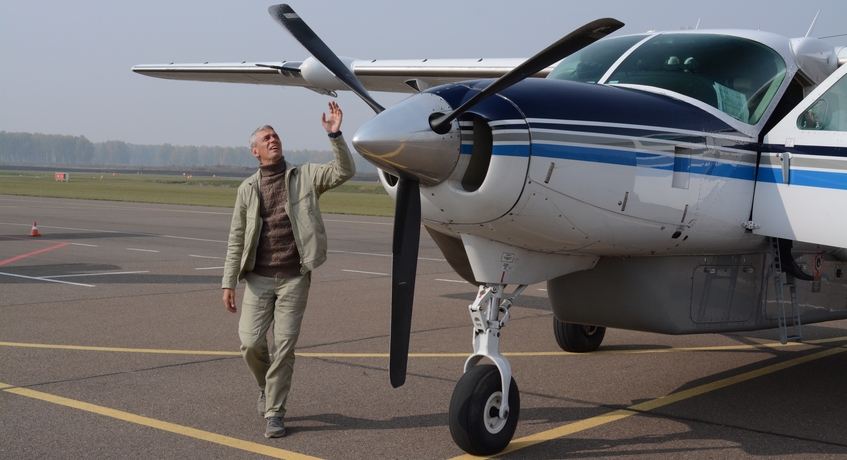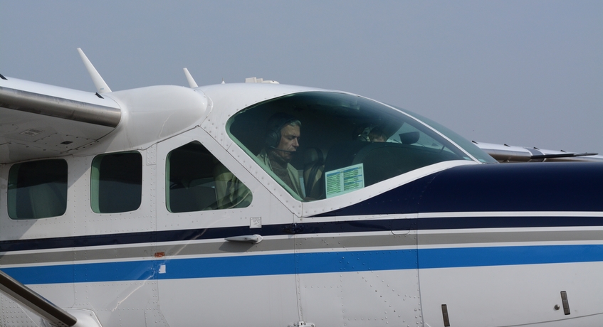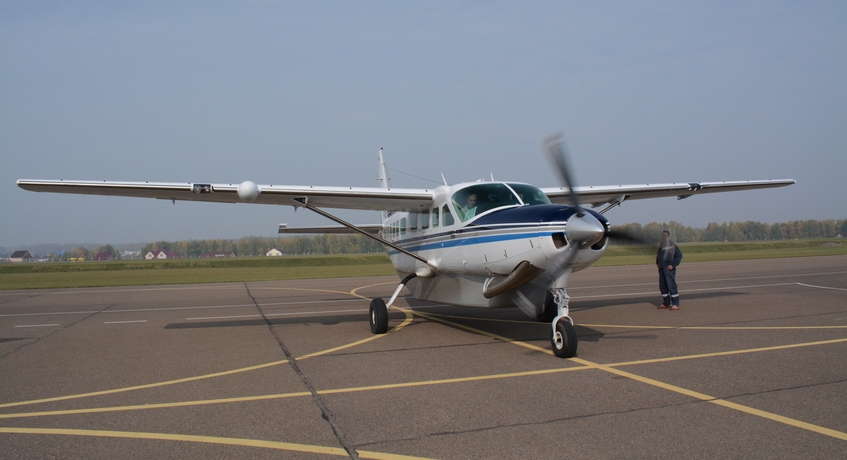 Cessna 208B Grand Caravan - лёгкий одномоторный турбовинтовой самолёт с неубирающимися шасси, выпускается компанией «Cessna Aircraft Company», США. Самолет оснащен цифровой авионикой Garmin G1000, двигателем Pratt & Whitey PT6A-114A, мощностью 675 л.с., 3-х лопастным винтом McCauley.