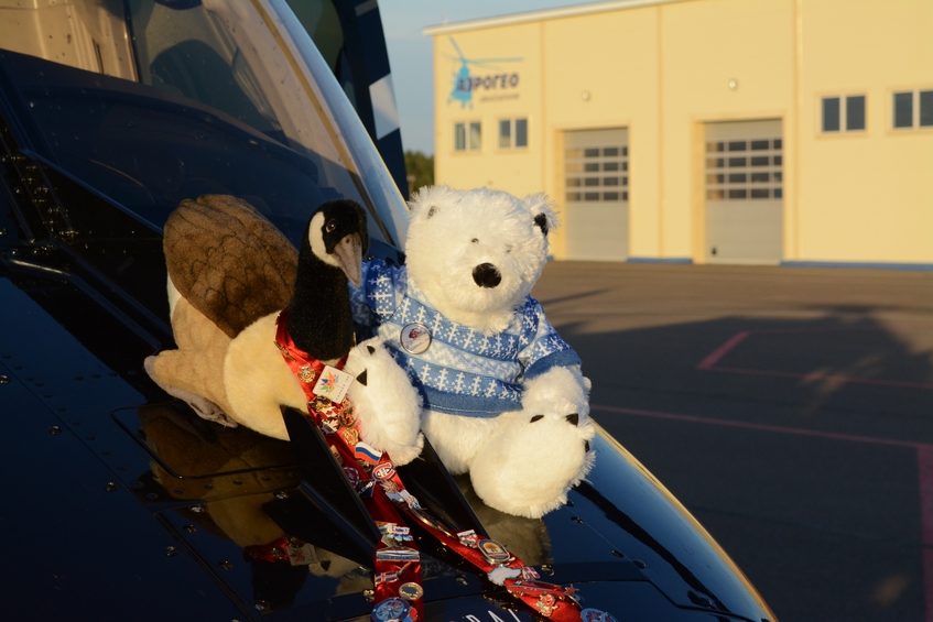 Канадский экипаж путешествует по миру с Гагарой, одним из символов их страны. В каждом месте посадки экипажа, на шарфик Гагары добавляются значки этих мест, так у нас коллекция пополнилась значком «АэроГео», а также теперь у Гагары есть плюшевый друг – Белый медведь, побывавший с экипажами нашей авиакомпании на Северном полюсе.