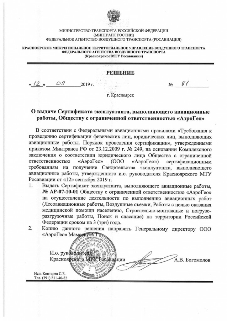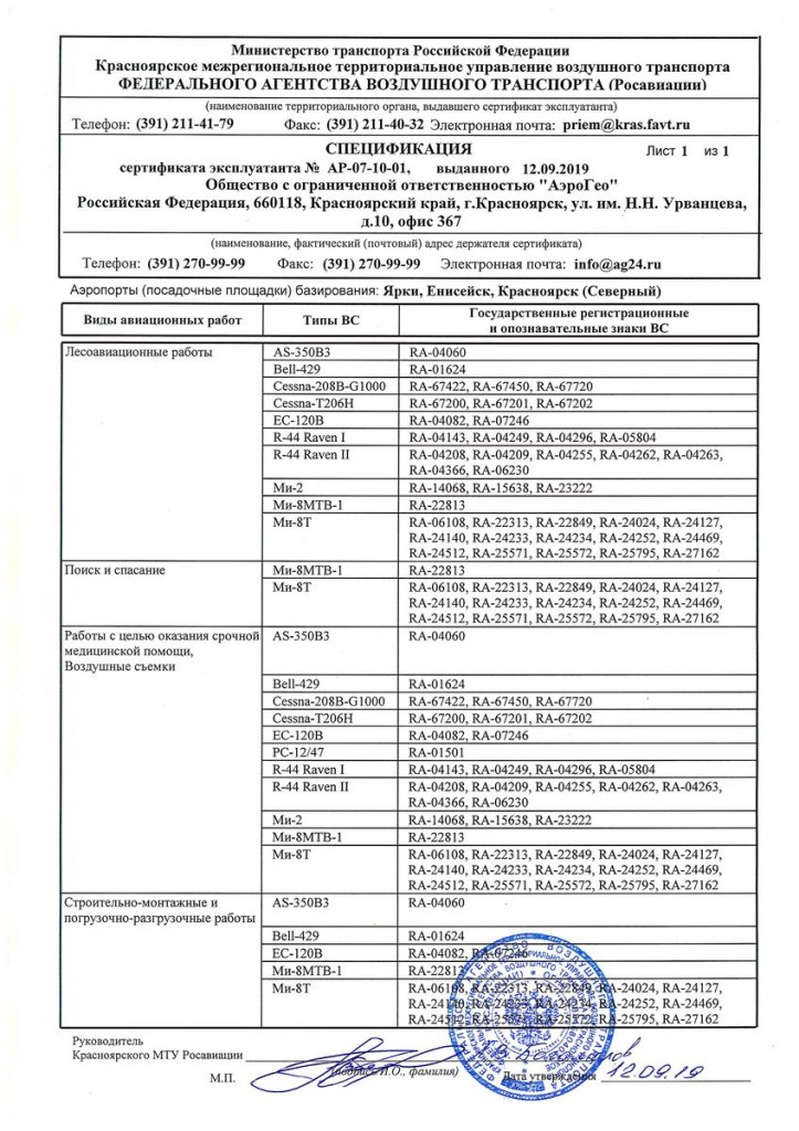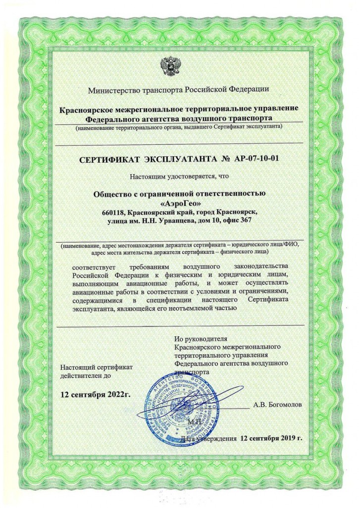ООО «АэроГео» продлило Сертификат эксплуатанта на выполнение авиационных работ еще на три года, до 12 сентября 2022 года. Данный сертификат удостоверяет в том, что авиакомпания «АэроГео» соответствует всем сертификационным требованиям воздушного законодательства Российской федерации, предъявляемым к физическим и юридическим лицам, выполняющим авиационные работы.