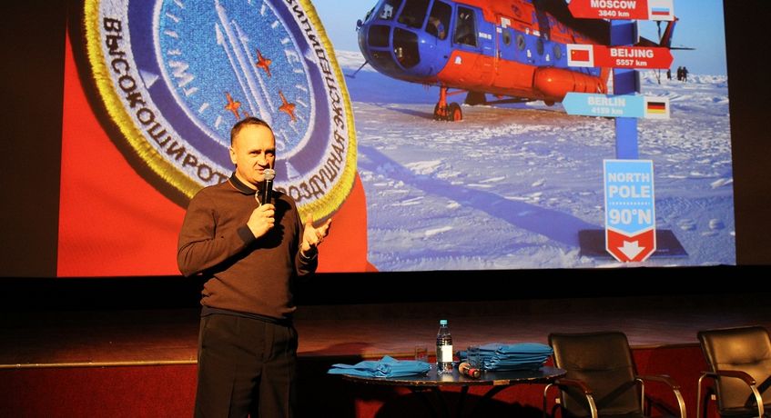 Авиакомпания «АэроГео» и Красноярское краевое отделение РГО организовали в красноярском «Доме кино» вечерний лекторий, посвящённый работе специалистов авиакомпании на Северном полюсе.
