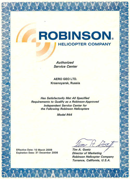 ООО «АэроГео» становится сервисным центром американской компании Robinson Helicopter Company.