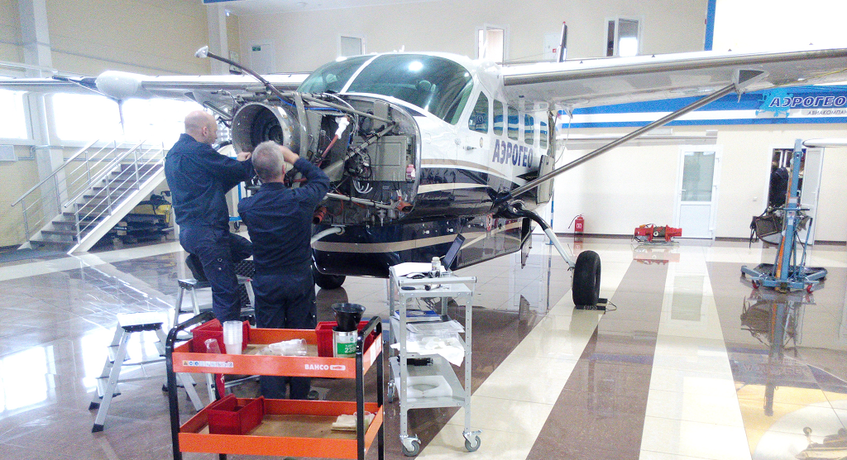 14 ноября 2014 года были успешно завершены работы по выполнению первой инспекции горячей части (HSI) двигателя PT6A-114A самолёта Cessna 208B Grand Caravan, принадлежащего ООО «АэроГео». Работы выполнялись специалистами ИАС ООО «АэроГео». Произведена замена соплового аппарата турбины компрессора и проточка сегментов кожуха турбины.