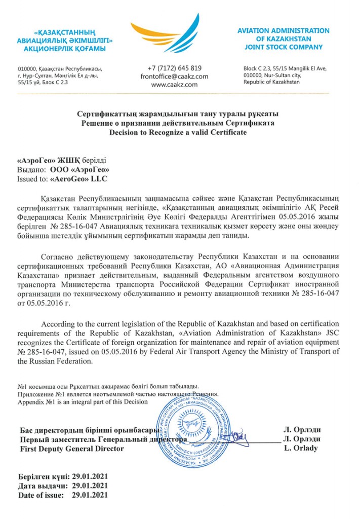 Авиакомпания «АэроГео» прошла согласование и получила возможность осуществлять техническое обслуживание воздушных судов в Казахстане. В феврале 2021 года АО «Авиационная Администрация Казахстана» признала Сертификат ООО «АэроГео» по техническому обслуживанию действительным на территории Республики.
