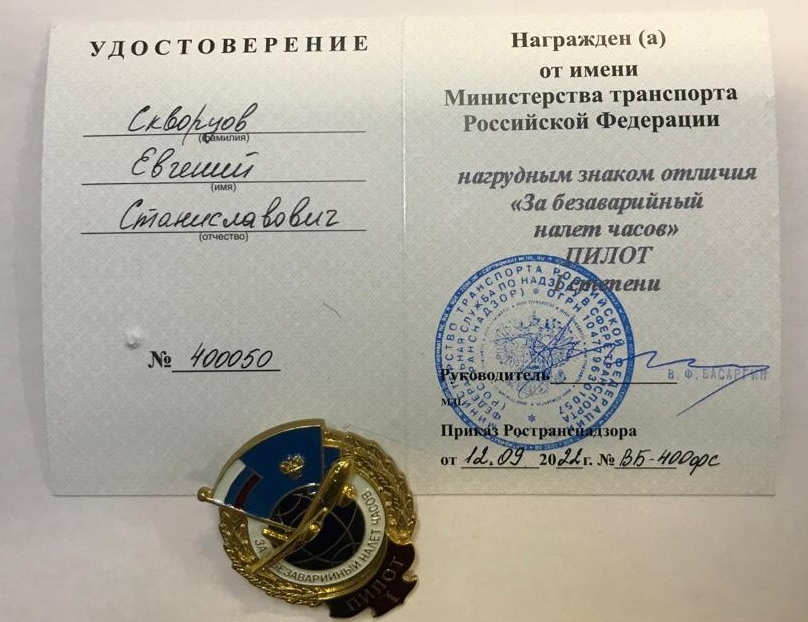 «За безаварийный налет часов» I степени с планкой «Пилот» награжден Скворцов Евгений Станиславович КВС Ми-8 ООО «АэроГео».
