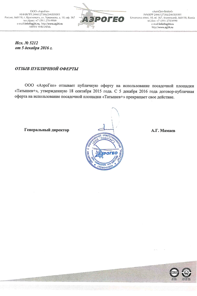 ООО «АэроГео» отзывает публичную оферту на использование посадочной площадки «Татышев+», утвержденную 18 сентября 2015 года. С 5 декабря 2016 года договор-публичная оферта на использование посадочной площадки «Татышев+» прекращает свое действие.