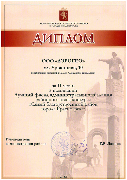 Авиакомпания «АэроГео» заняла 2 место в номинации «Лучший фасад административного здания» конкурсе «Самый благоустроенный район города Красноярска» в Советском районе. Жюри оценивали фасады офиса и прилежащую территорию.