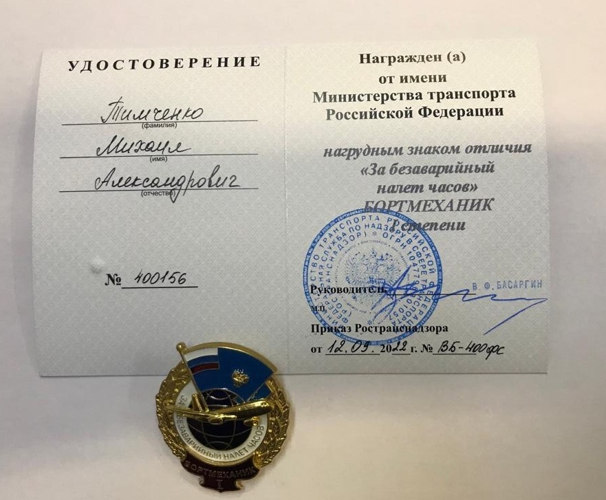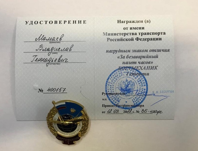 Нагрудный знак отличия «За безаварийный налет часов» I степени с планкой «Бортмеханик» вручен Мамаеву Владиславу Геннадьевичу – бортмеханику-инструктору Ми-8 и Тимченко Михаилу Александровичу – бортмеханику Ми-8 авиакомпании «АэроГео».