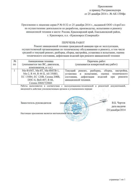 Во исполнение Постановления РФ от 28.03.2012 г. №240 «О лицензировании разработки, производства, испытания и ремонта авиационной техники» ООО «АэроГео» получило Лицензию (серия Р №0132 от 25.12.2014) на ремонт авиационной техники гражданской авиации при её эксплуатации, осуществляемый организациями по техническому обслуживанию и ремонту, в том числе, средний и текущий ремонт, разборка, сборка, настройка, установка и испытание, оценка технического состояния, дефектация изделий при ремонте авиационной техники (Ми-8Т, Ми-8АМТ, Ми-8МТВ-1, Ми- 2, R44, R44 II, AS350B3, EC130B4, EC120B, Bell407, R66, DHC-6, Cessna 208B, Cessna206H/T206H).
