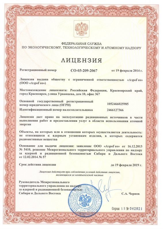Спектр авиауслуг «АэроГео» пополнился эксклюзивным дополнением. На основании Лицензии на право эксплуатации радиационных источников в части выполнения работ и предоставления услуг в области использования атомной энергии СО-