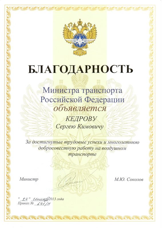 За достигнутые трудовые успехи, многолетнюю добросовестную работу на воздушном транспорте пилоту-инструктору воздушного судна Ми-8 ООО «АэроГео» С. К. Кедрову объявлена Благодарностью министра транспорта Российской Федерации М. Ю. Соколова.