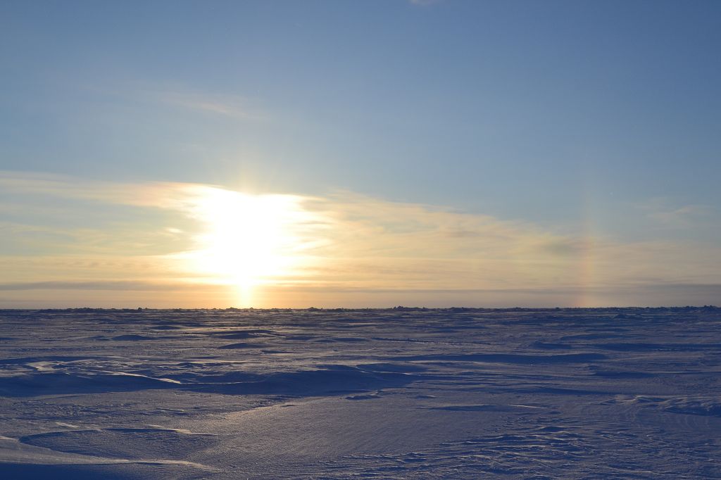 Видимо, где-то недалеко появилась открытая вода, из-за этого возникла какая-то белёсость, повысилась влажность воздуха. Возможно, это связано с полнолунием, которое было во вторник - известно, что во время полнолуния часто происходит подвижка льда, вот и экспедиционный лидер Виктор Серов заметил, что по маршруту к Северному полюсу появилось много разводий. А ещё с маршрута передают, что часто встречаются медведи (в открытой воде они добывают себе пропитание, а заодно держат в тонусе путешественников. В каждой группе есть оружие на случай непредвиденной встречи с хищником "нос к носу".